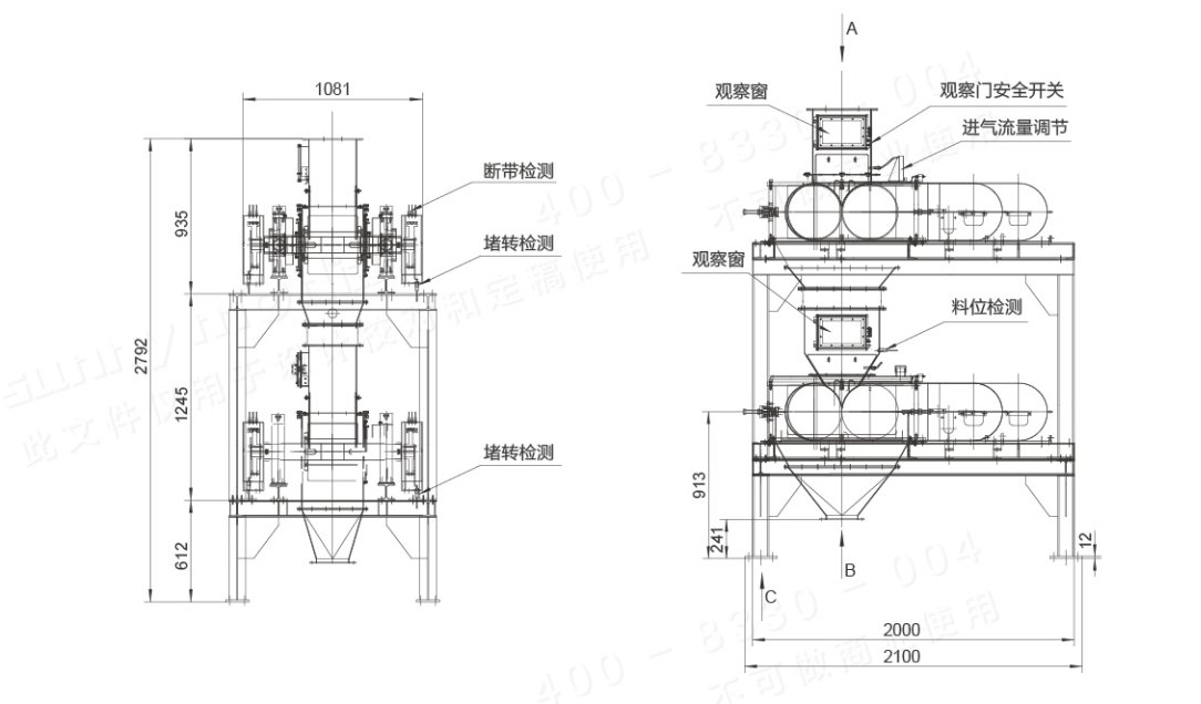 4. 進料口及一層和二層之間設置堵料傳感器(物理檢測),物料發生堵塞時可以報警