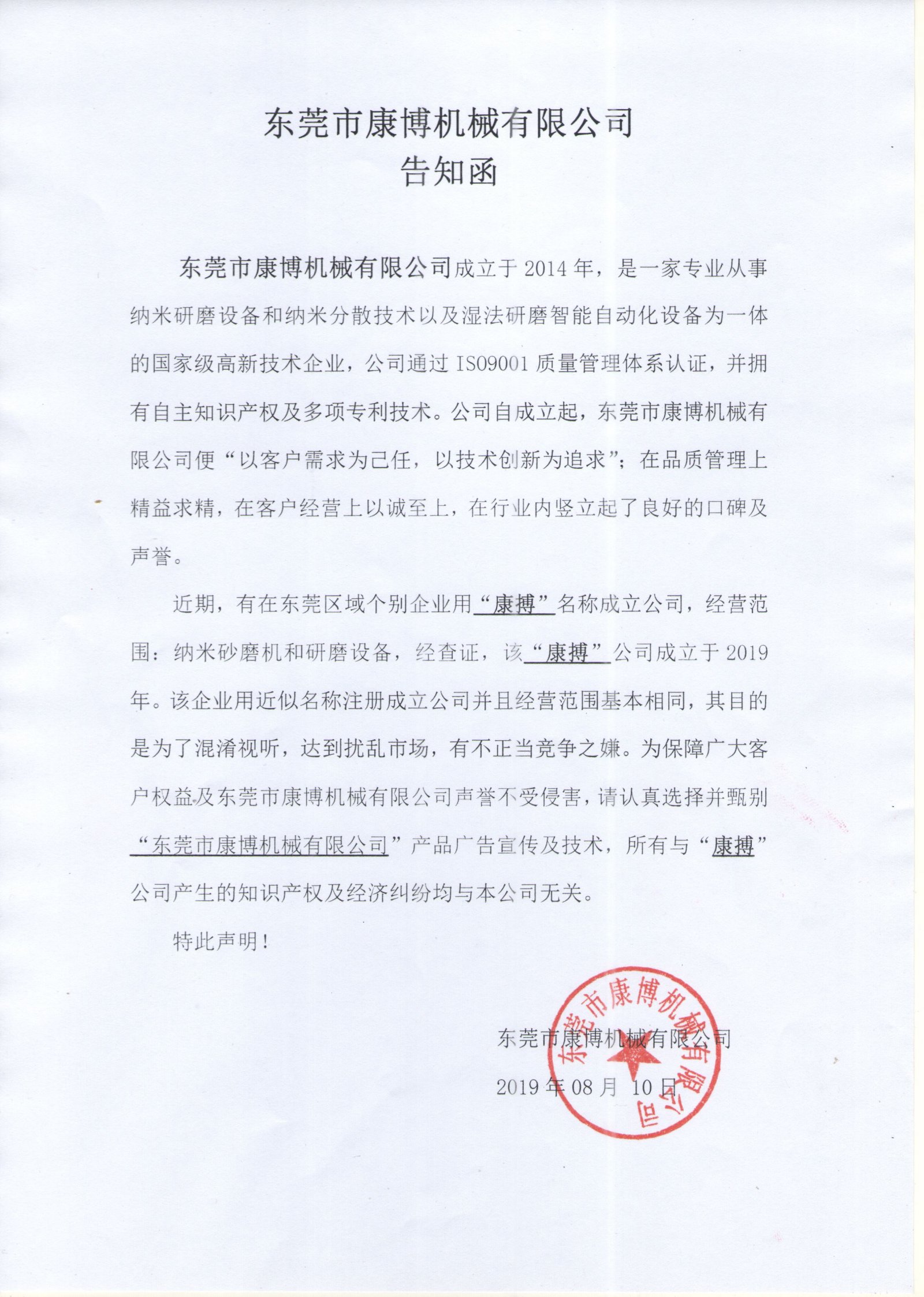 近期,有在東莞區(qū)域個別企業(yè)用“康搏”名稱成立公司,經(jīng)營范圍:納米砂磨機和研磨設(shè)備,經(jīng)查證,該“康搏”公司成立于2019年。該企業(yè)用近似名稱注冊成立公司并且經(jīng)營范圍基本相同,其目的是為了混淆視聽,達到擾亂市場,有不正當競爭之嫌。為保障廣大客戶權(quán)益及東莞市康博機械有限公司聲譽不受侵害,請認真選擇并甄別“東莞市康博機械有限公司”產(chǎn)品廣告宣傳及技術(shù),所有與“康搏”公司產(chǎn)生的知識產(chǎn)權(quán)及經(jīng)濟糾紛均與本公司無關(guān)。