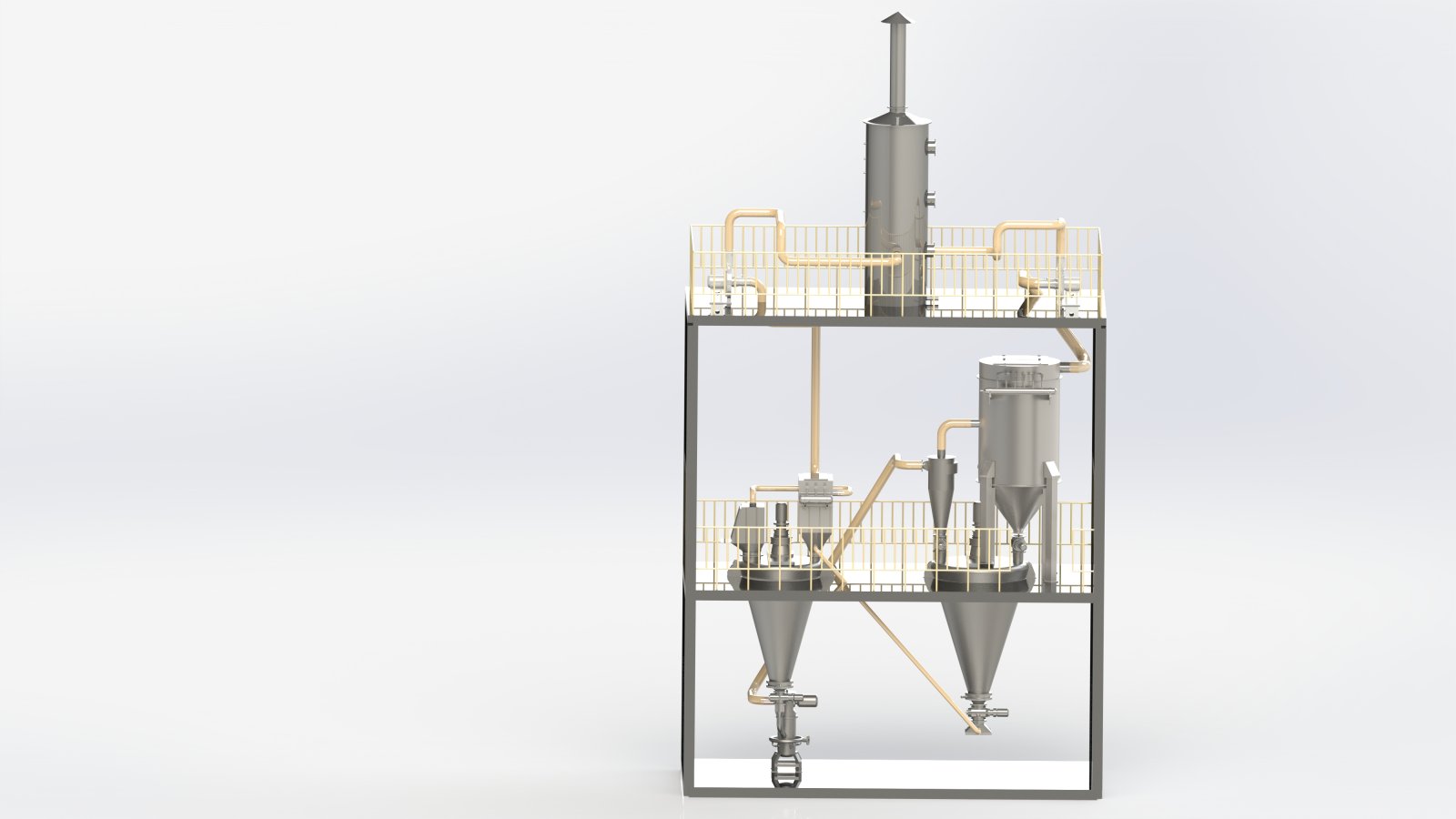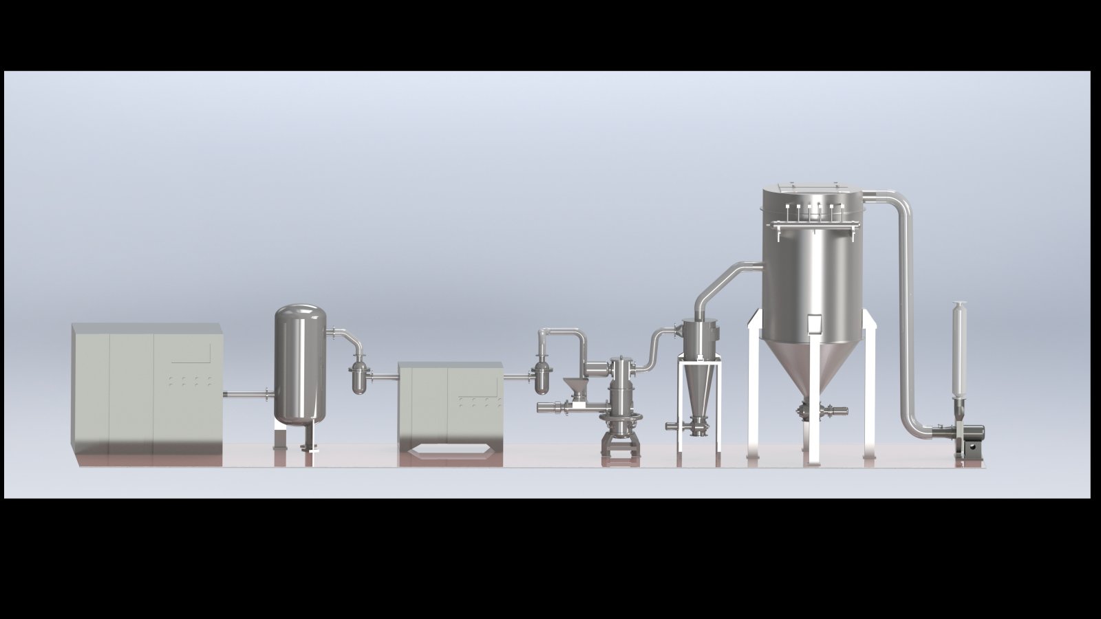 此氣流粉碎機系統由空壓機、儲氣罐、精密過濾器、空氣冷凍干燥機、流化床氣流粉碎機、混合機、投料裝置、旋風分離器、除塵器、引風機、水膜除塵器、星型出料閥等組成,可實現農藥連續生產。