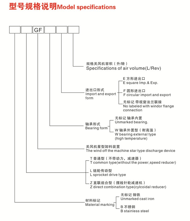 (5)特殊型號、特殊材質、非標規格可按用戶需要制造。(6)例:ZGF9L說明:容積為9L的組合型碳鋼關風機。