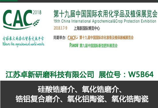第十九屆中國國際農用化學品及植保展覽會CAC2018將于3月7-9日在上海新國際博覽中心N1-N5及E7館舉辦。江蘇卓新研磨科技有限公司期待與您相約!
