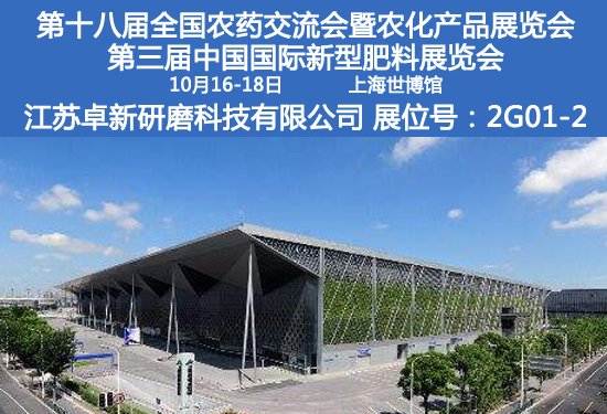 由中國農藥工業協會主辦的“第十八屆全國農藥交流會暨農化產品展覽會、第三屆中國國際新型肥料展覽會”將于10月16-18日在上海世博館舉辦。金秋十月,江蘇卓新研磨科技有限公司與您相約ACE。