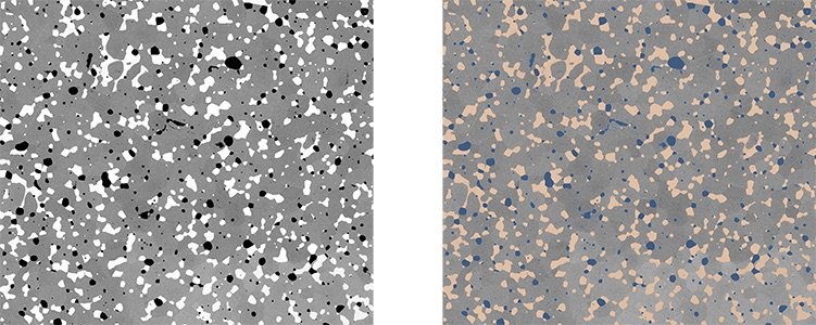 30 張掃描電鏡(SEM)圖的拼接圖像(左下方)。總采集時間不到 3 分鐘。分析拼接圖像的晶粒晶界,如右下方所示,結果顯示此陶瓷樣品的黑色為 5%,灰色為 78%,白色為 17%。利用晶粒尺寸與分布數據可對加工條件進行優化,以滿足產品要求。