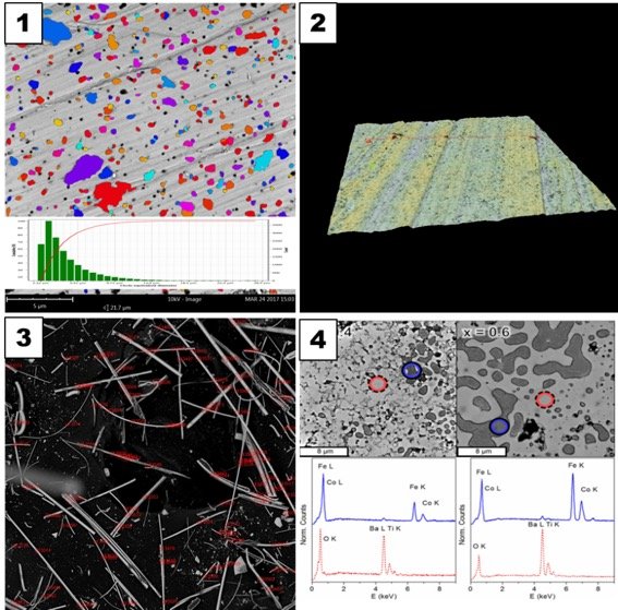 下圖1,利用顆粒系統,對第二相進行晶粒度統計,并導出柱狀圖;圖2,對材料表面進行 3D 立體重建,也可以進行粗糙度測量;圖3,利用纖維系統,對陶瓷纖維直徑與方向進行統計;圖4,利用能譜對材料進行元素成分分析。