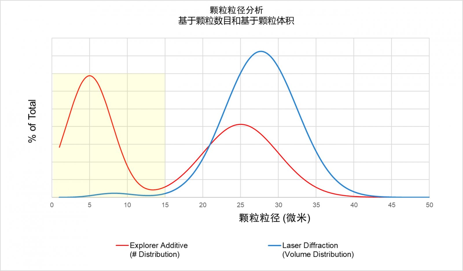 上圖表顯示了對相同粉末采用兩種不同技術分析的結果對比。從高亮顯示的區域可以看出,較小的顆粒數量非常顯著(見數量分布),而這些顆粒的的體積貢獻相當低(見體積分布)