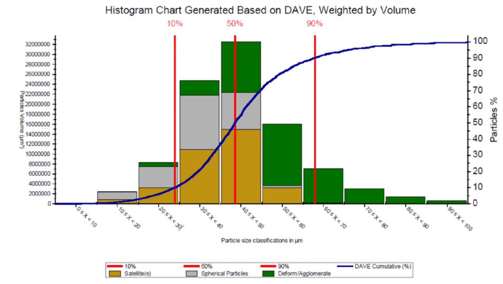 Ti-6Al-4V 粉末中球形顆粒、衛星球顆粒和變形顆粒的體積分布