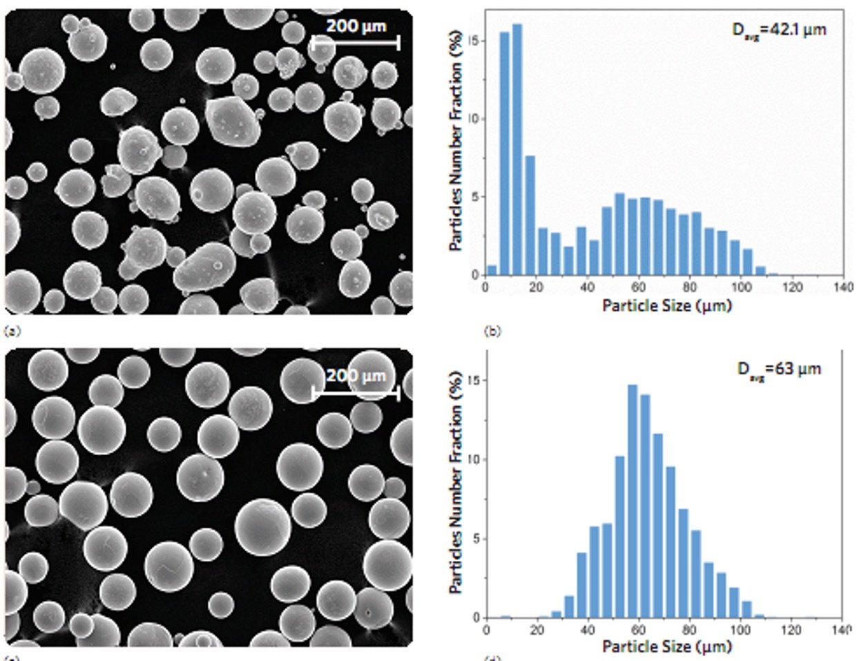 對供應商 A (a, b) 和供應商 B (c,d) Ti-6Al-4V 粉末使用掃描電鏡獲得的二次電子圖像及對應的顆粒粒度分布。