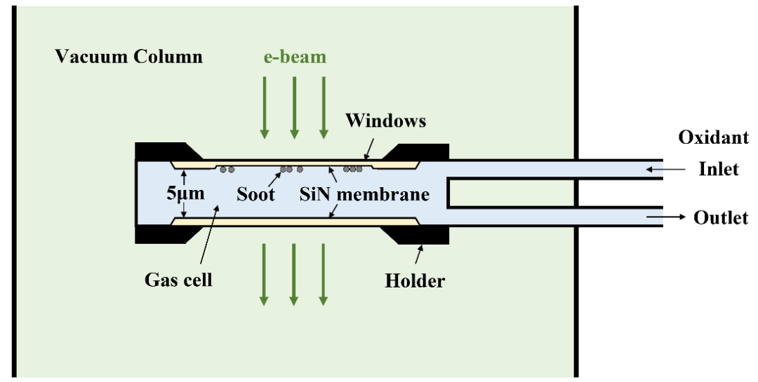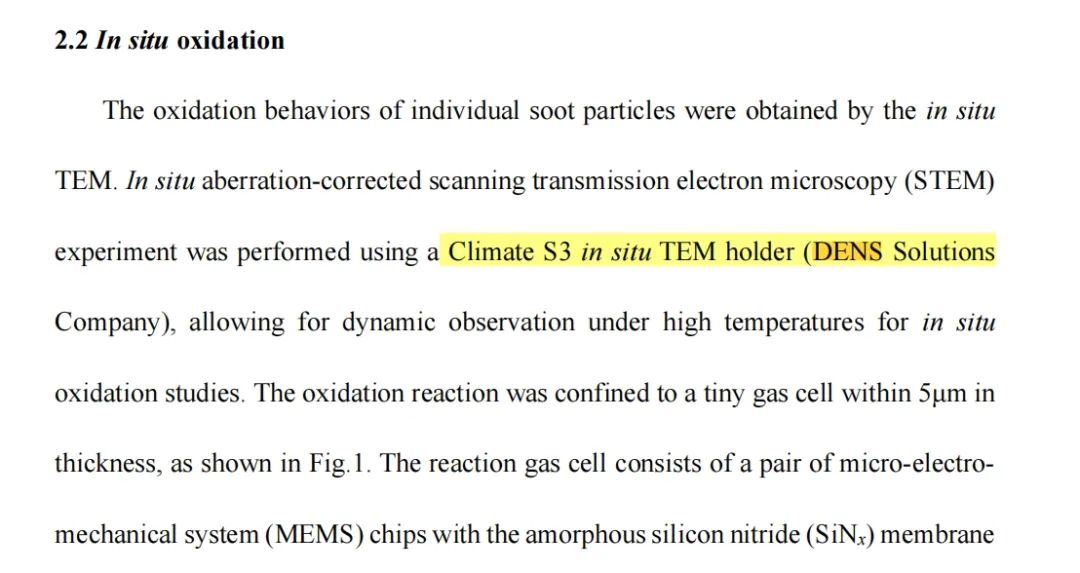 所使用的系統(tǒng)- Climate 氣相加熱桿:使用 DENS Climate 原位氣相加熱樣品桿,研究團(tuán)隊(duì)可以在透射電鏡中向樣品區(qū)通入氣氛并同時(shí)加熱,從而原位研究煙塵納米顆粒的在高溫下的氧化過程。