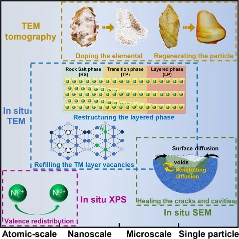 對于廢棄鋰離子電池的退化正極材料的直接再生利用是一種環境可持續、且性價比較高的“變廢為寶”策略。然而,微觀層面的再生機制和相應過程的動力學仍舊處于未知狀態。該工作中,研究者們試圖通過多種方法展現了退化 NCM523 材料的再生機制。并使用了一系列的原位(TEM、SEM、同步輻射 XPS)、非原位(TEM 重構、EDS 重構、電化學測量)表征技術建立了 NCM523 再生機制的完整物理化學圖像。之后從原子尺度、納米尺度、微米尺度直至單顆粒水平,對包括巖鹽相到層狀相的逆轉變、缺陷(空洞、裂紋)愈合、金屬離子的價態轉變在內的重要動力學細節進行了討論。最后,通過系統性的理論分析和全電池電化學測試對上述細節進行了補充討論。該研究為退化正極材料的直接再生利用提供了深入的理解,對將來開發和優化電池材料的再生策略具有啟發意義。