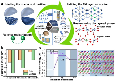 圖 2. a. 多尺度觀察 NCM523 材料直接再生機制的示意圖;b. NCM523 結構塊體、表面鋁離子分別替換鎳離子、鈷離子、錳離子的形成能對比;c. 鋁摻雜和未摻雜的 NCM523 的鎳從 TM 層到鋰層的擴散勢壘。