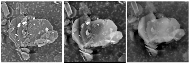 石墨顆粒在不同加速電壓(5kV、10kV、15kV)下的三張照片:5kV 時的束流穿透是最弱的,展示了最多的結構信息,具有更好的形貌襯度。