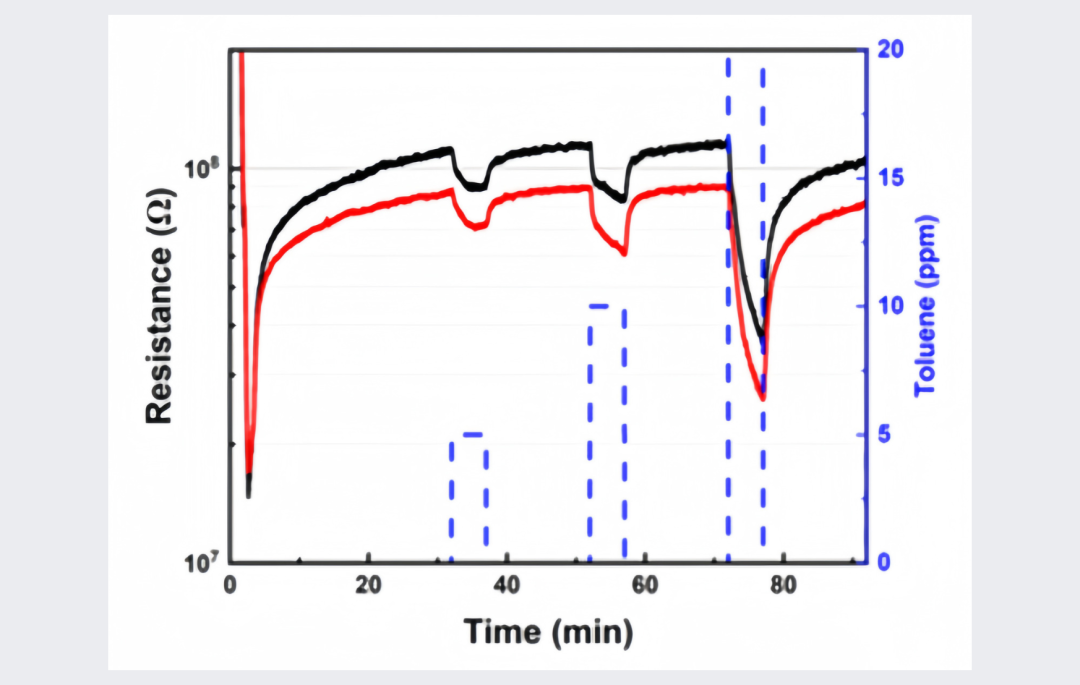 兩個氧化鋅基化學電阻器(CR1和 CR2)在暴露于三個連續甲苯脈沖后的實時電阻