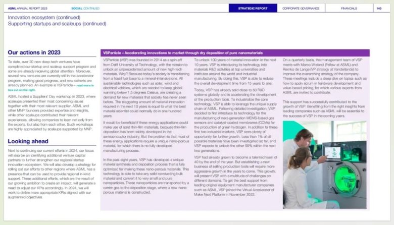 荷蘭阿斯麥光刻 ASML 是半導體行業的領先供應商,為芯片制造商提供硬件、軟件和服務,以大規模生產集成電路(芯片)。在其 2023 年年度報告中稱贊 VSParticle 的旅程不僅體現了其當前的成功,也體現了其重塑材料科學的創新方法。隨著 VSParticle 在材料研究方面不斷取得突破,Make Next Platform 的支持將助力推動創新和引領更廣泛的技術進步。