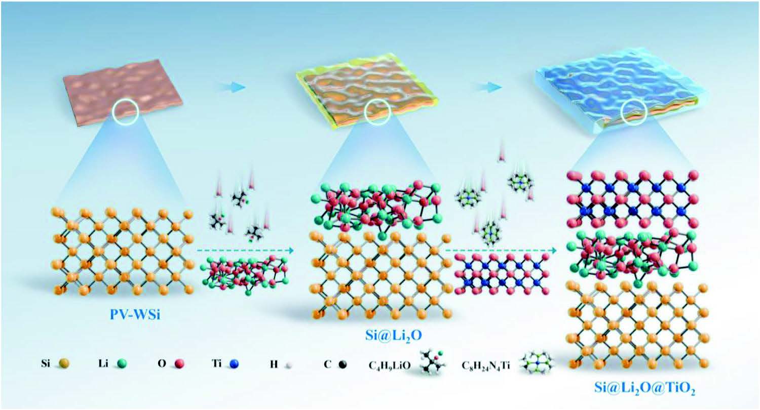 本文作者提出利用光伏硅廢料的二維結(jié)構(gòu)特性,借助Forge Nano PROMETHEUS 流化床原子層沉積系統(tǒng)在硅廢料表面連續(xù)、可控地沉積非晶 Li2O 和 TiO2 包覆層,以制備高倍率(20 A·g-1電流下放電比容量大于900 mAh·g-1)和高首效(90.9%)硅基負(fù)極材料,為光伏硅廢料的增值利用提供了新思路。相關(guān)論文發(fā)表在 Advanced Functional Materials 上。昆明理工大學(xué)冶金與能源工程學(xué)院博士研究生王雷和陸繼軍博士為論文共同一作者,李紹元教授、馬文會教授為論文共同通訊作者。