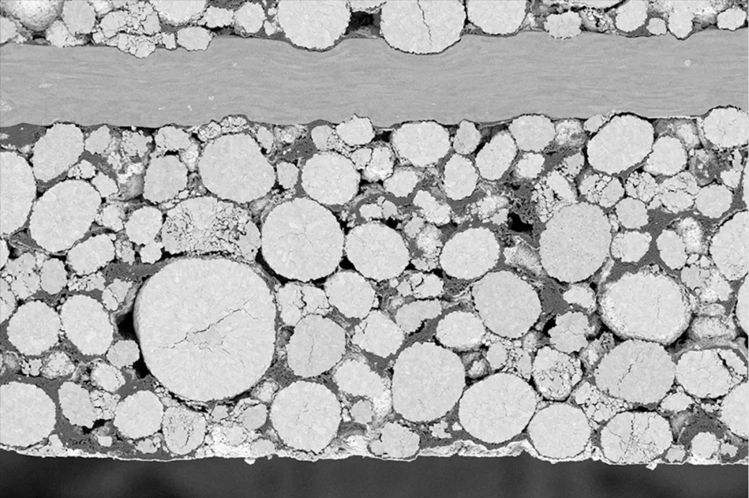 圖1.將多晶三元材料通過離子研磨儀切割后,可以觀察到顆粒內部的真實情況。(來源:Technoorg Linda)