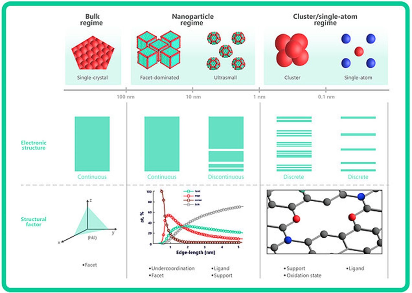 圖 2:各種催化劑尺寸隨原子利用率的增加而變化,其電子結(jié)構(gòu)和決定反應(yīng)性的主導(dǎo)結(jié)構(gòu)因素也隨之變化【5】