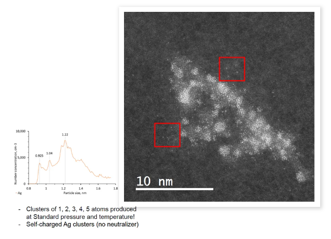 而在更高分辨率的 TEM 下,可以發(fā)現(xiàn)使用多元金屬產(chǎn)生的納米簇周圍出現(xiàn)明顯的分散原子以及原子簇(圖四)。而在另一項實驗中,根據(jù) DMA & API TOF mass 數(shù)據(jù)顯示,如果采用 Ag 電極,可以在大氣壓條件下產(chǎn)生大量的 2nm 以下團(tuán)簇以及 5個原子以下的原子簇[9]。