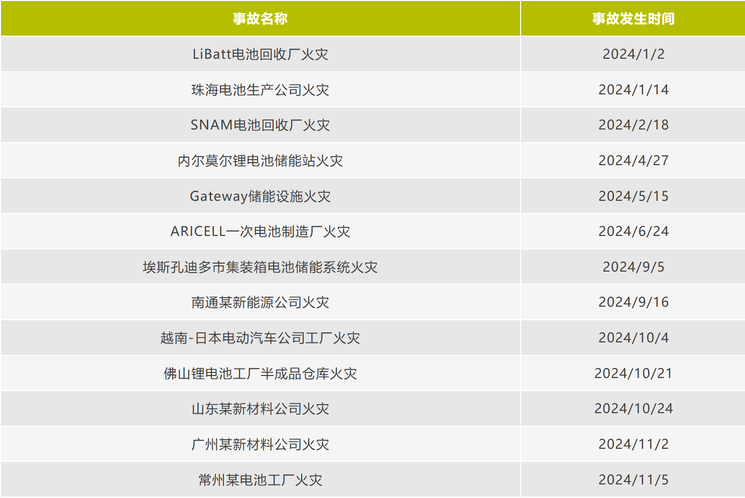 2024 年 1 月至 11 月間,全球范圍內發生了多起鋰電池工廠及儲能系統相關的安全事故,這些事故觸目驚心,不僅造成了人員傷亡或財產損失,也引發了對于鋰電池安全性的廣泛關注。