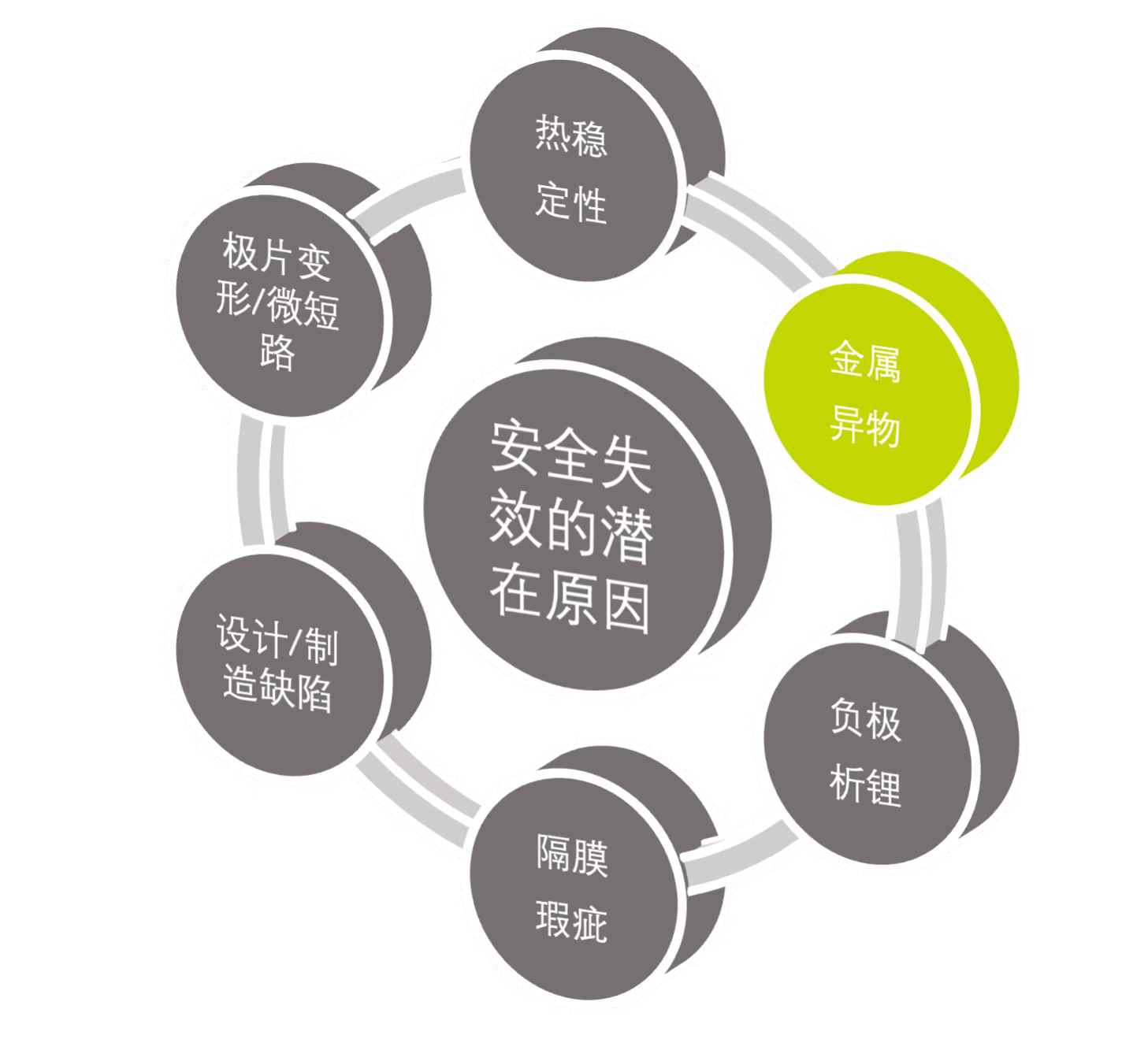 同時,影響電池安全的因素也有很多,包括:熱穩定性、金屬異物、負極析鋰、隔膜瑕疵、設計 / 制造缺陷、極片變形 / 微短路等。