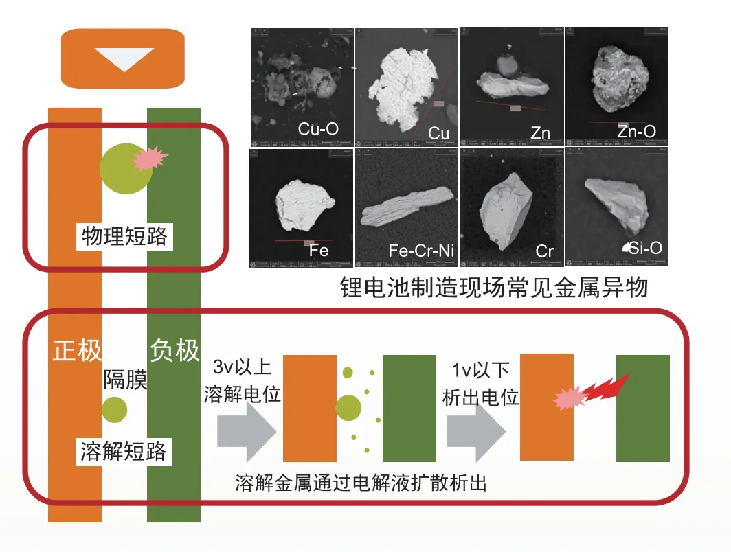 在《鋰離子電池正極材料的質量管理》中明確指出,鋰離子電池的性能與正負極材料的質量息息相關。當在正負極材料中存在金屬雜質時,這些金屬會先在正極氧化再到負極還原,當負極處的金屬單質累積到一定程度,其沉積金屬堅硬的棱角,就會刺穿隔膜導致電池自放電,從而導致電池失效,甚至引發熱失控和火災,不管是三元鋰電池,還是磷酸鐵鋰電池,針對原材料中金屬異物的檢測是非常重要的。