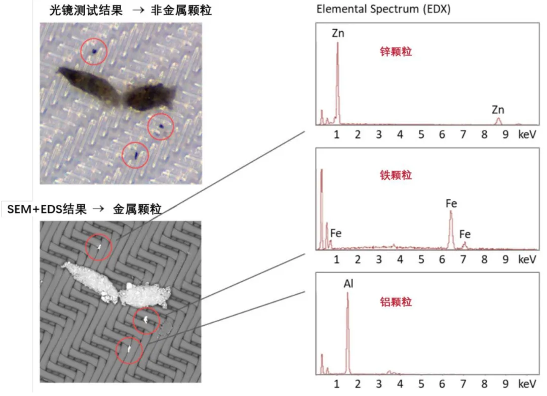 目前,各大動力電池廠家對于金屬異物的管控都進行了深入的研究。為了有效評估金屬顆粒的危害性,需要知道顆粒的詳細成分,光學顯微鏡目前應用廣泛,但是只能區分金屬和非金屬,但具體是哪類金屬則無從得知,也會造成金屬與非金屬的誤識別,對小尺寸顆粒的統計準確性較低,無法分析顆粒的可能來源。因此,這就需要借助電子顯微鏡。