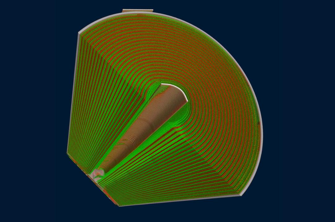 圖1使用 Neoscan N90 高分辨納米CT 以 580nm 體素尺寸掃描鋰電池,內部結構得以清晰展示。