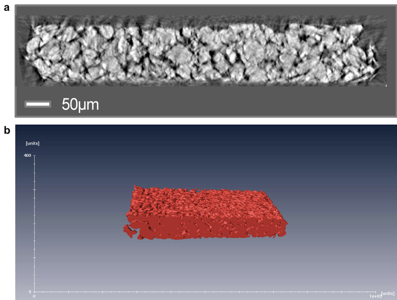 圖3 使用 nano ct 以 480nm 體素尺寸掃描石墨負極,(a) 來自斷層掃描序列的單個切片。 (b) 300個獨立的斷層掃描切片的渲染圖(尺寸為43 × 348 × 144微米)。圖片來源于文獻【1】