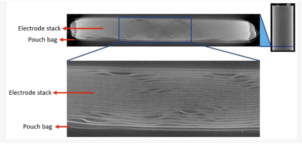 圖4 G1C 軟包電池在化成后但循環前的 X 射線計算機斷層掃描橫截面。放大視圖以高分辨率拍攝(體素大小為 8.5μm)。右圖表示橫截面(電池底部)的高度。圖片來源于文獻【2】