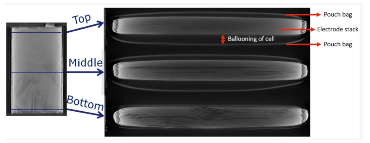圖5 進行壽命測試(未進行壓縮)后,軟包電池頂部、中部和底部的 X 射線計算機斷層掃描橫截面。膨脹在圖所示的頂部和中間橫截面中清晰可見(參見袋和電極層堆棧之間的暗區)。圖片來源于文獻【2】