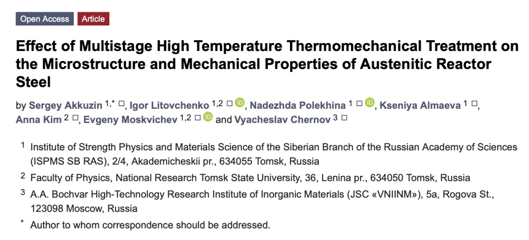 研究新型多級高溫熱機械處理(HTMT)對奧氏體反應堆鋼的變形微觀結構與力學性能影響。結果顯示,在逐階段降溫(1100℃、900℃、600℃,)時塑性變形的 HTMT 可細化晶粒、增強鋼強度。用 SEM EBSD 和 TEM 在兩截面研究鋼的晶粒、晶界及缺陷亞結構特征。探討了變形亞結構形成及高溫拉伸時動態應變時效對鋼力學性能的影響。本研究的多級 HTMT 可用于提升奧氏體鋼強度。
