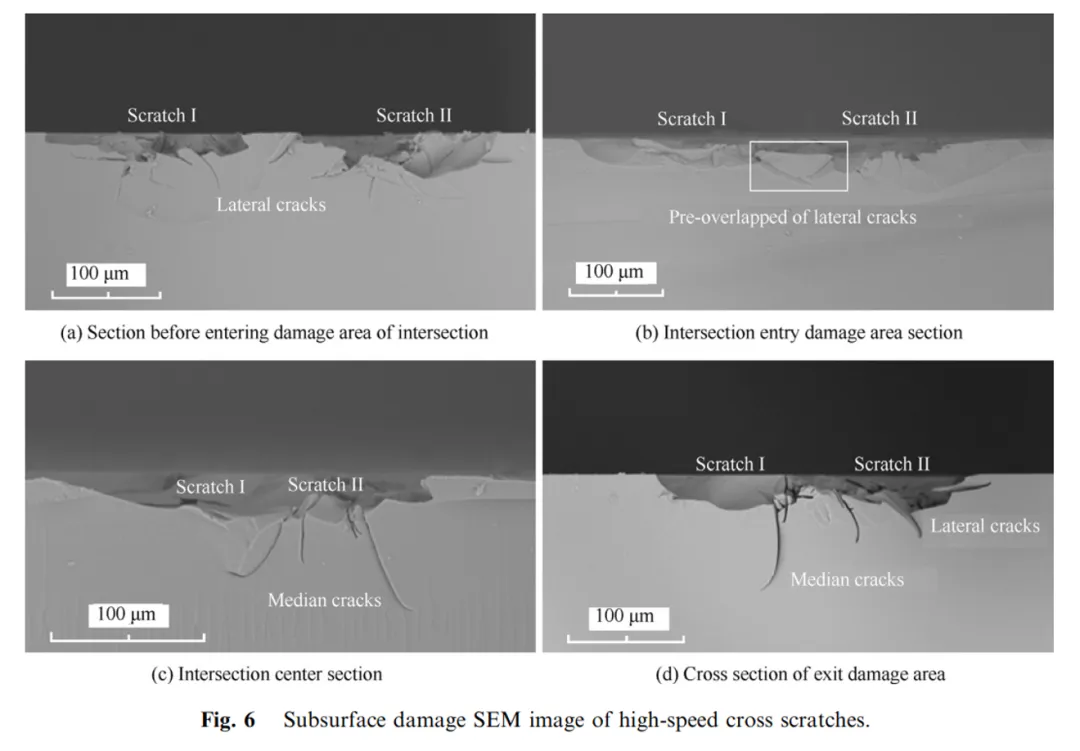 航空光學元件精密低損磨削可提加工效率。多磨粒高速交叉劃傷機制影響工件成型質量,磨粒軌跡相互作用決定加工面及亞表面形貌與損傷。依磨損顆粒相對工件表面運動軌跡建擺線軌跡交角理論模。經實驗獲不同交叉角高速劃痕,探究其干涉與損傷累積機制。結果顯示,交叉劃痕的兩裂紋系分別基于不同原理,交叉角小損傷半徑大,交叉處力曲線時長增半峰寬增,損傷累積促裂紋擴展,使損傷范圍增大。