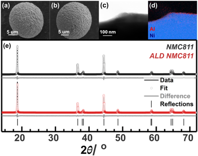 1右圖為利用圖1. (a)合成后的 NMC811 和(b)ALD NMC811 次級顆粒的掃描電子顯微鏡(SEM)圖像;(c)ALD NMC811 顆粒的明場像以及(d)對應的Ni(藍色)和Al(紅色)的能譜分析(EDX)圖。X射線(波長λ = 1.5406 ?)衍射圖(e)比較了NMC811(黑色)和ALD NMC811(紅色)的實驗數據(實線)、Rietveld精修結果(空心圓)、數據與擬合之間的差異(灰色線)以及R3m空間群預期反射的位置(垂直刻度)。