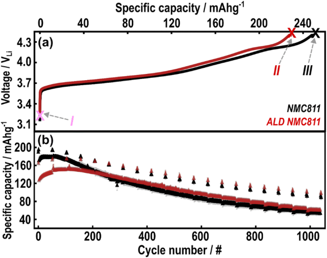 圖3. (a)NMC811(黑色)和ALD NMC811(紅色)首次充電(假設實際容量為200 mAh g?1,充電速率為C/20)的電壓曲線。圖中的交叉點表示通過事后核磁共振(post-mortem NMR)分析的樣品狀態:粉色交叉點(I)表示浸泡在1 M LiPF?的EC/EMC電解液中的ALD NMC811;紅色交叉點(II)表示充電至4.4 V(用DMC沖洗)的ALD NMC811;黑色交叉點(III)表示充電至4.4 V(用DMC沖洗)的NMC811。(b)展示了NMC811和ALD NMC811在C/2倍率下進行49次老化循環以及在C/20倍率下進行2次診斷循環的放電容量隨長期循環的變化。