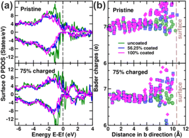 圖4. 電子態密度和Bader電荷:(a)展示了原始和75%脫鋰(充電)的NMC811結構中表面氧的投影態密度(PDOS)。圖中分別考慮了三種情況:無鋁存在(綠色)、鋁部分(56.25%)替代表面過渡金屬(藍色)以及鋁完全替代表面過渡金屬(紫色)。在b方向上,表面施加了高達20 ?的真空層。黑色虛線表示費米能級。(b)展示了從體相(0 ?)到表面(10.8 ?,用棕色虛線標記)方向的Bader電荷分布。理想化的O2?周圍的價電子電荷應為8個電子,但在Bader電荷劃分中被低估(從完全鋰化結構的體相中約7個電子到脫鋰情況下的體相中約6.75個電子)。