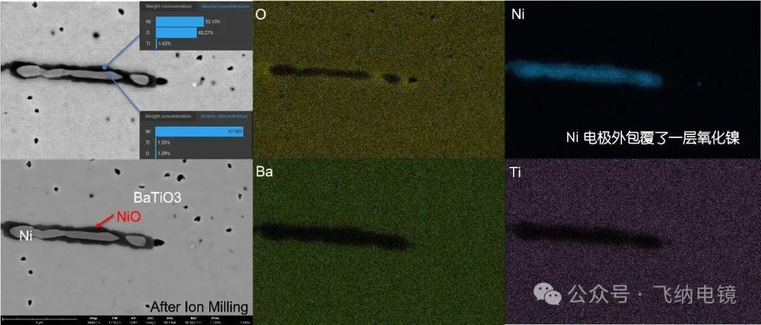 使用 Technoorg Linda 離子研磨儀處理 MLCC 電極后,結(jié)合飛納臺式場發(fā)射電鏡能譜分析,發(fā)現(xiàn) MLCC 內(nèi)電極存在被氧化現(xiàn)象。