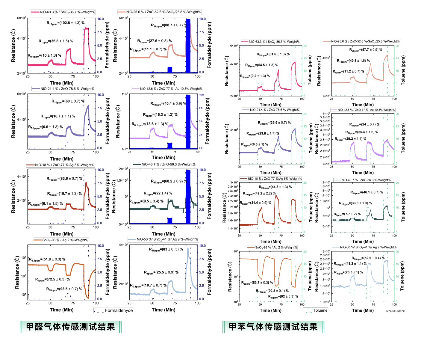在本案例中,基于金屬氧化物半導(dǎo)體(MOS)及金屬催化劑的納米多孔層(NPLs)通過印刷方式沉積在多傳感器陣列平臺上,并以甲苯和甲醛作為目標(biāo)氣體進行測試。最多三種不同組分的 NPLs 被用作傳感層。研究從靈敏度、選擇性、響應(yīng)/恢復(fù)時間及檢出限(LOD)等關(guān)鍵性能指標(biāo)出發(fā),系統(tǒng)分析了材料組成對氣體傳感性能的影響。