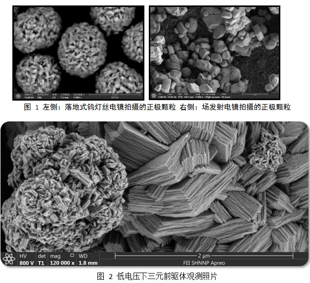 隨著電池對(duì)正極要求的增加,納米級(jí)的正極材料也應(yīng)運(yùn)而生。而納米級(jí)的顆粒要獲得良好的細(xì)節(jié)信息,則通常使用場(chǎng)發(fā)射電鏡進(jìn)行觀察分析。這主要是場(chǎng)發(fā)射電鏡可以在較低的電子束電壓下良好成像,因?yàn)閳?chǎng)發(fā)射的亮度更高,從而可以在低電壓下激發(fā)出足量的用于分析的信號(hào)。低能的電子在樣品中的相互作用區(qū)域減小,信號(hào)所反映的信息就只來自于樣品表面。