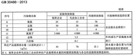 《制革及皮毛加工工業水污染物排放標準》(GB30486-2013)中明確規定了,制革及毛皮加工企業水污染物排放值、監測和監控要求,以及標準的實施和監督等相關規定,其中2014年3月1日后新建企業其污水中總鉻的排放標準為1.5mg/L,六價鉻的排放標準為0.1mg/L,其排放監控位置為車間或生產設施廢水排放口;2014年3月1日前已有企業其污水中總鉻的排放標準為1.5mg/L,六價鉻的排放標準為0.2mg/L,其排放監控位置為車間或生產設施廢水排放口;2016年1月1日后,所有企業均按新建企業標準執行。