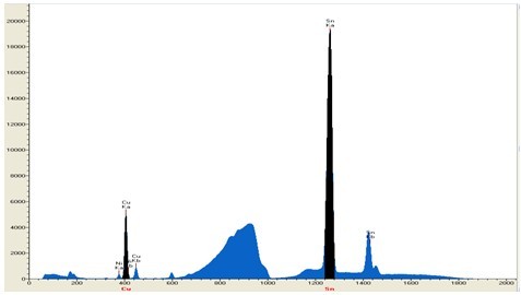 客戶提供電鍍液要求測試Cu和Sn元素.其含量大致范圍分別為:Cu:0.2%—2.4g/L;Sn:15%—40g/L。客戶自己提供一組標液,將標液放入特制樣品杯中使用EDX 1800B儀器制作測試工作曲線,對樣品進行測試。工作曲線線性圖如下: