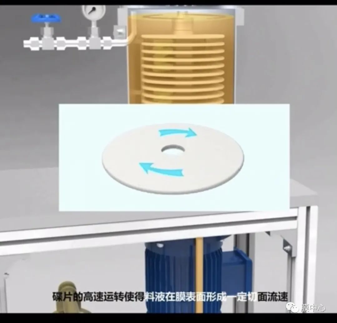 在泵和壓力(2-3kg)的作用下,將高粘度,高 濃度物料打進膜組件做高速旋轉(zhuǎn)運動,濾液以 切線方式,在壓力作用下穿過膜孔,通過中空 軸流出。而濃縮物(固形物)由于高速旋轉(zhuǎn)形 成湍流,不斷沖刷膜片表面,防止固形物停留 在膜盤表面,從而有效的防止了膜表面污堵, 保證過濾正常進行,從而起到濃縮作用。