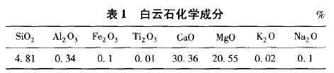 實(shí)驗(yàn)原料為工業(yè)級(jí)白云石,純度94.68% ,粒徑小于2 m的微粒占10% , 由青島某公司提供,主要化學(xué)成分分析見表1。