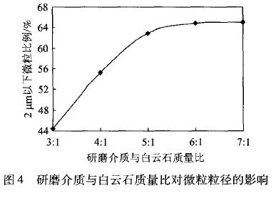 由圖4可以看出,粒徑小于2 m的微粒比例隨研磨介質(zhì)與白云石質(zhì)量比的增加而快速增大;質(zhì)量比為3:1時(shí),微粒粒徑在2 m以下所占比例比較低,僅為44.4% ,表明轉(zhuǎn)子的能量不能有效地作用于白云石微粒上,造成“空研” 現(xiàn)象嚴(yán)重¨ ;隨研磨介
