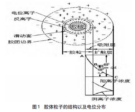 水性涂料的基本成分是乳膠粒。在乳液聚合時,單體進入乳化劑形成的膠束中,然后通過引發劑的聚合作用得到膠體粒子。乳膠粒表面的電位離子在靜電場的作用下,將溶液中帶有相反電荷的粒子吸引到乳膠粒周圍,電位離子和反離子互相作用,形成了雙電層,反離子層由反離子擴散層和吸附層互相作用形成,其中反離子吸附層中的反離子可以隨著膠核一起運動的,其又被稱為吸附層,它們距離膠核很近,吸附得非常牢固。而反離子擴散層中的反離子不會隨著膠核一起運動,且里面的反離子與膠核之間的距離比較遠。膠核表面擁有熱力學電位,而在擴散層的表面也有電位,其被稱為ξ電位。電位的大小代表膠體粒子的帶電情況,一般情況下,電位的數值越大,膠體粒子帶的電就越多,擴散層就會越厚。乳液之所以比較穩定,是因為同種類的膠體粒子帶著相同的電荷,而同種電荷由于受到電場力的影響,互相排斥,使它們可以長時間的懸浮在水中,而不會凝結到一起。一般情況下,乳液中的膠體粒子的穩定與ξ電位有關,ξ電位越高膠體粒子就越穩定。下面是膠體粒子的結構以及電位分布圖:(見圖1所示)。