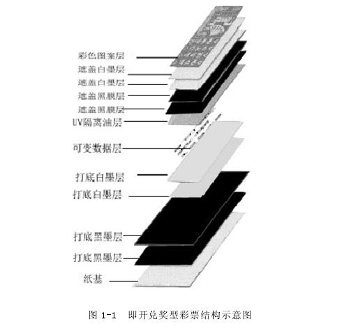 近年來(lái),隨彩票、證券行業(yè)的興起,像刮刮卡這種即買(mǎi)即開(kāi)兌獎(jiǎng)型彩票,給印刷業(yè)提供了大量的印刷業(yè)務(wù)。彩票(即開(kāi)兌獎(jiǎng)型彩票)一般由卡紙、遮蓋打底層(黑白各兩層)、可變數(shù)據(jù)信息層、隔離油層、遮蓋層(黑白各兩層)、彩色圖案層等組成,如圖 1-1 所示。
