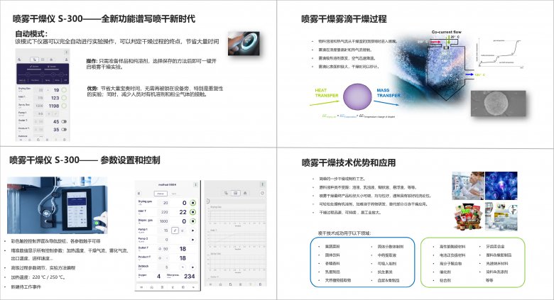 接著祝經理又從噴霧干燥技術原理和應用、全新噴霧干燥儀 S-300 介紹、新噴霧干燥儀器操作和做樣展示、噴霧干燥技術應用四個方面做了分享。
