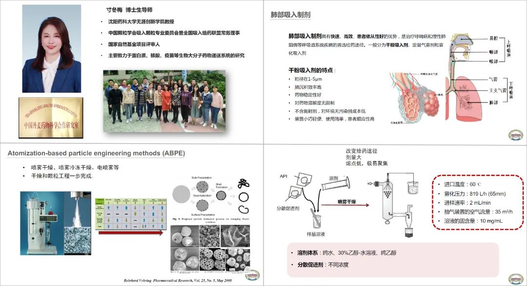 沈陽藥科大學教授寸冬梅分享了噴霧干燥技術在干粉可吸入制劑中的研究,從肺部吸入制劑與噴霧干燥技術簡介、以及噴霧干燥技術在大劑量小分子藥物肺吸干粉制劑研發的應用、復方肺吸干粉制劑研發中的應用、生物大分子納米復合肺吸干粉制劑研發中的應用做了案例分享,并針對目前的情況做了總結與展望。