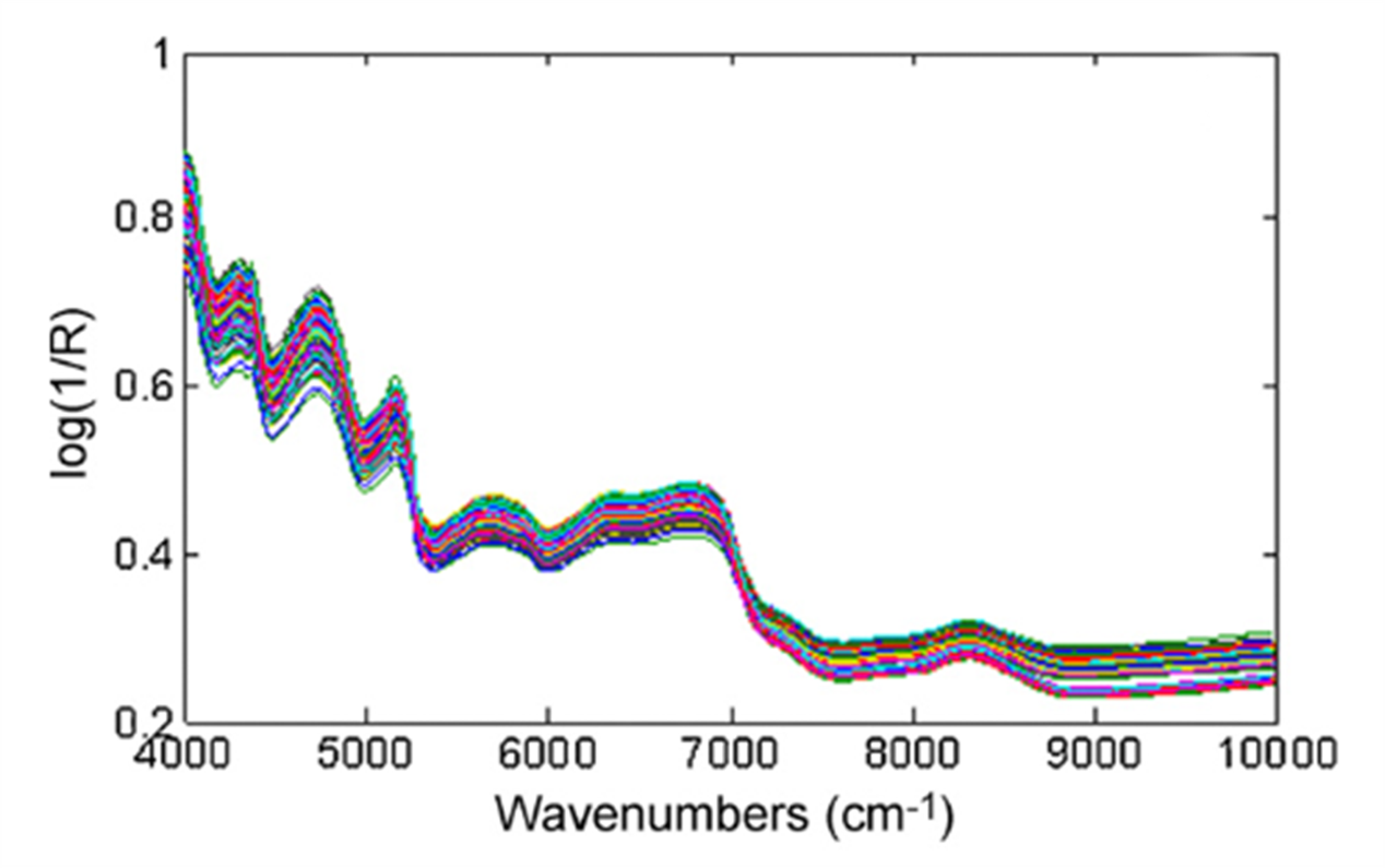 產地來自安徽、廣州、河南、江蘇、福建等五地的太子參共 85 株,在 105 °C 烘箱中干燥 5 小時,隨后刷去表面泥土,磨碎成粉過 80 目篩。處理后的樣品測量近紅外光譜時,保證裝量樣不少于 1 g,環境溫度 25 °C 且濕度恒定,每條光譜掃描 32 次,檢測范圍 10000 cm-1 到 4000 cm-1,共 3112 個變量。氨基酸含量的測量采用茚三酮比色法。