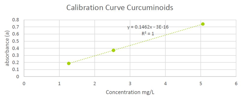 將 0.5 mL, 1 mL 和 2mL 原液轉移到三個不同的 100mL 容量燒瓶中,用乙醇定量。對于0.5 mL、1 mL和2 mL轉移的原液,這些標準溶液分別含有 1.25、2.5 和 5 mg/L 的姜黃素(根據確切重量而定)。