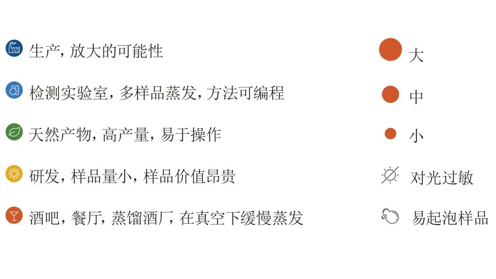 對于較大體積的樣品,工業(yè)級旋轉(zhuǎn)蒸發(fā)儀是完美的解決方案。R-220 Pro 和 R-250 Pro 可以一次處理 10 L 到 30 L 的樣品溶劑,包括光敏和易起泡的樣品。得益于大體積單次處理量,工業(yè)級旋轉(zhuǎn)蒸發(fā)儀往往用在中試和放大工藝實驗室以及工廠里。在應(yīng)用方面,制藥、天然產(chǎn)物、酒廠和香精香料都是其擅長的領(lǐng)域。根據(jù)不同的配件,可以實現(xiàn)連續(xù)自動蒸餾,或者讓整機符合防爆工廠的要求,甚至可以邊萃取天然產(chǎn)物邊蒸餾!(點擊這里查看)