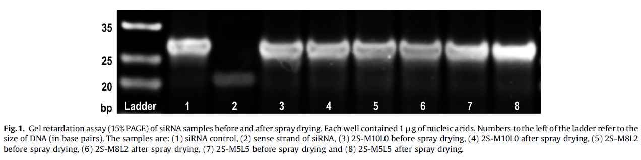 在許多體內研究中,siRNA 與遞送載體結合,并通過靜脈給藥,遞送載體可保護 siRNA 免受核酸酶降解和血清蛋白結合。對于呼吸系統的局部效應,吸入是一種有利的給藥途徑。在酶活性最低的作用位點可以實現高藥物濃度,其非侵入性提高了患者的依從性并降低了總治療成本。肺部給藥帶來的另一個吸引點是,可能不需要專門的給藥載體,而且裸 siRNA 可獲得令人滿意的基因沉默效果,這一點已在一些研究中得到證實。但關于 siRNA 的研究中,使用液體氣溶膠的研究相對較多,干粉可吸入制劑研究較為有限,本篇文獻中科學家重點研究了將裸 siRNA 以及和不同分散載體如甘露醇和L-亮氨酸通過噴霧干燥進行制劑來考察 siRNA 制備干粉可吸入制劑的可能性。